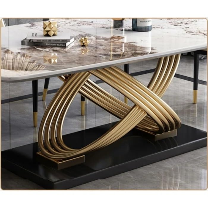 This dining table features a high-gloss marble finish tabletop paired with a stylish stainless steel designer base in a premium gold finish. The unique intertwined base structure not only adds visual appeal but also ensures excellent stability. The set comes with 6 ergonomically designed cushioned chairs that provide superior comfort and long-lasting support.